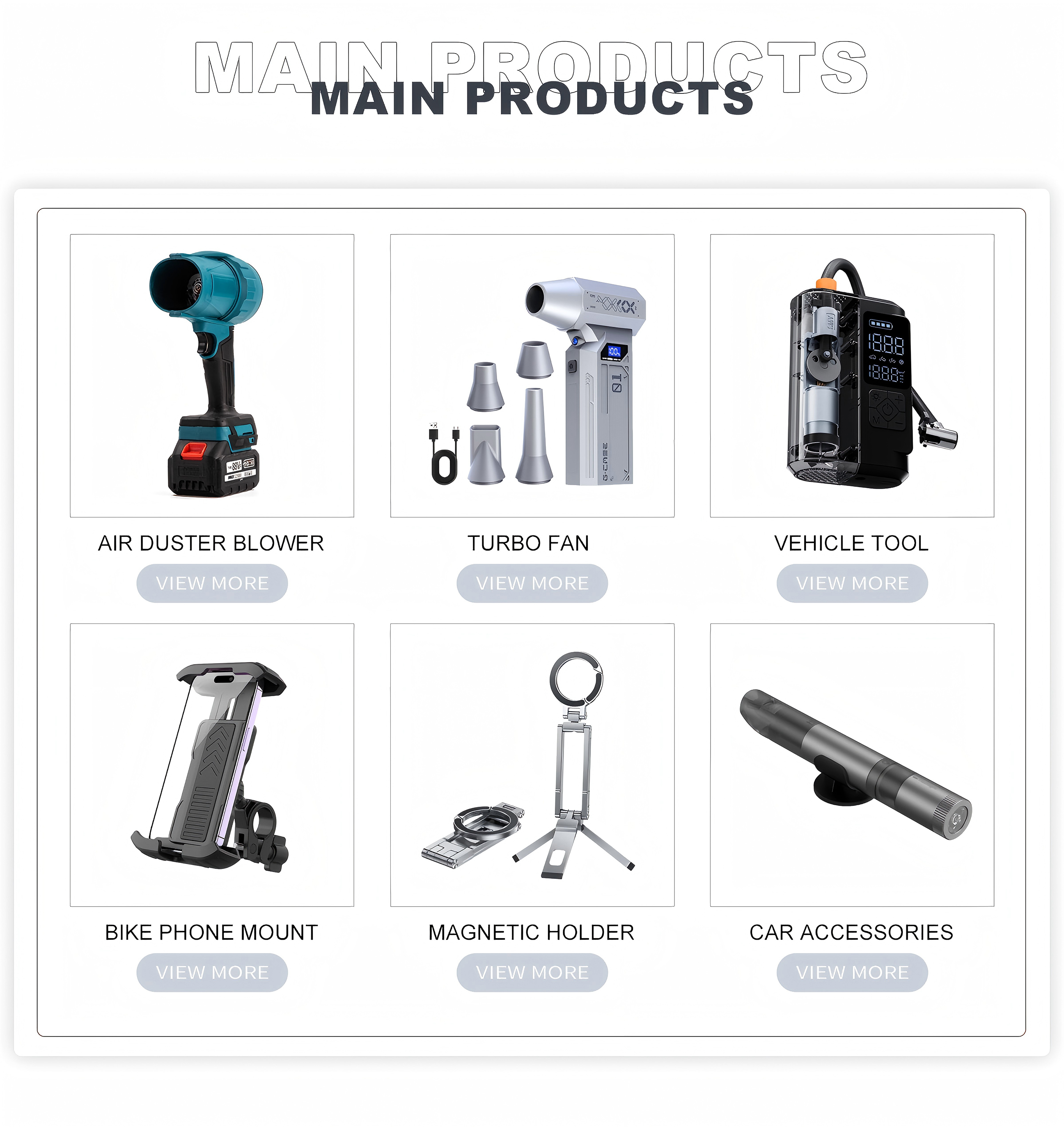Prodotti principali: Ventola Turbo, gonfiatore pneumatici, dispositivo di avviamento, supporto per auto, porta telefono bici