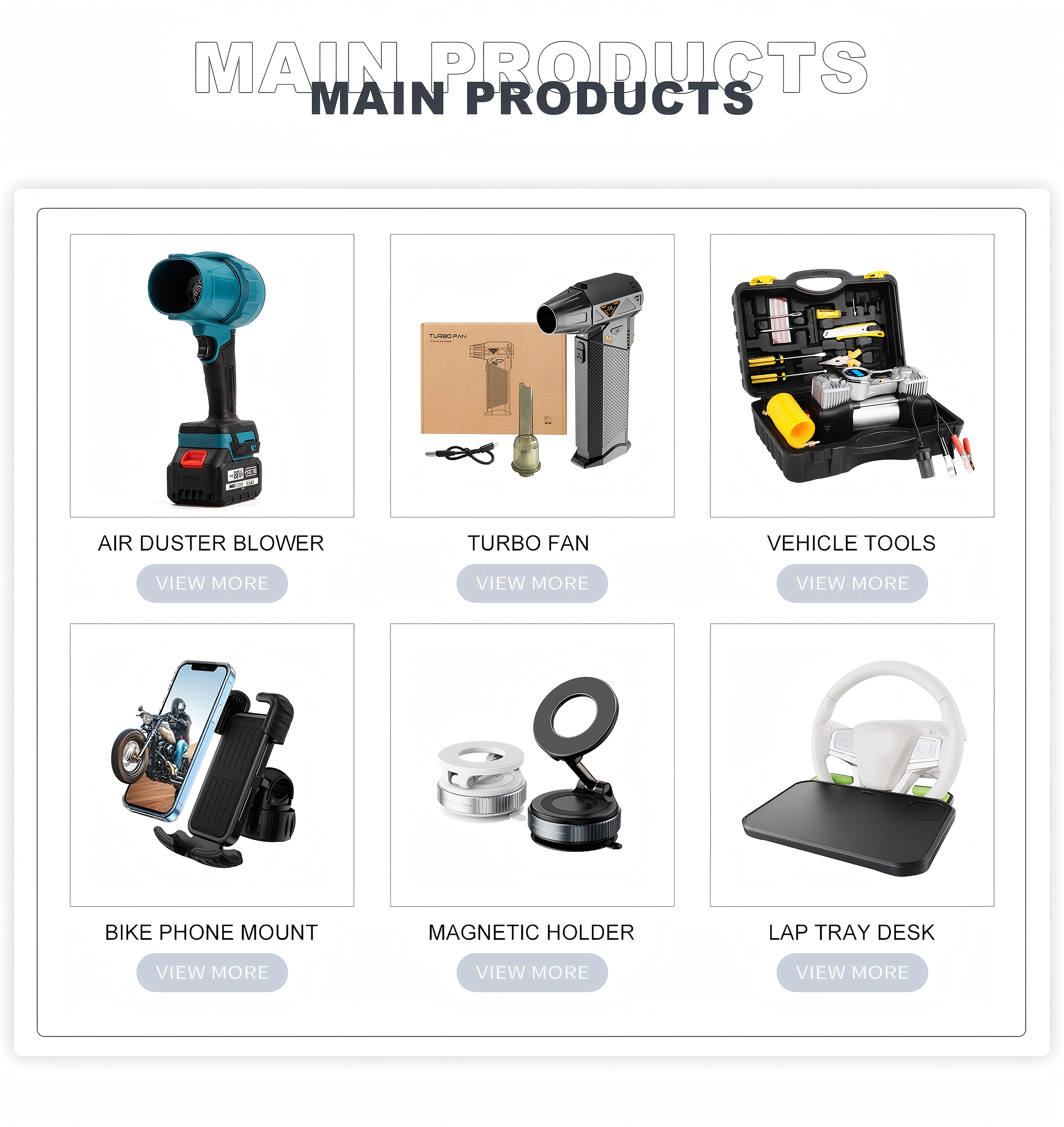 Productos principales:Turbo Jet Fan, inflador de neumáticos, arrancador de salto, herramienta de diagnóstico, soporte para automóvil
